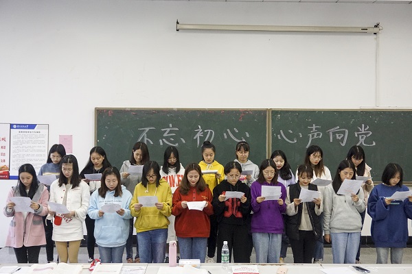 最后本次朗诵活动以经济学部第六组的一首气势磅礴的《七律·人民解放军占领南京》精彩收尾。整场朗诵会自始至终洋溢着慷慨激昂、热情活跃的气氛。活动结束后,17级新闻一班曹素丹说道:“参加本次预备党员培训实践活动能凝聚人心,多方式学习党的知识,增强预备党员们的爱国情怀。不忘初心是为人民谋幸福,心声向党是心口一致的向党组织靠近。”