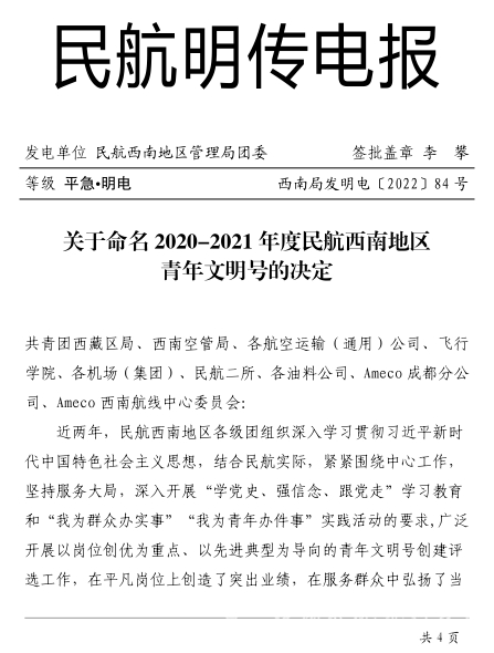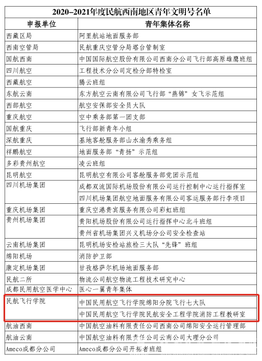 本网讯 安工学院 陈霞 刘全义 报道近日,民航西南地区管理局团委开展了2020-2021年度民航西南地区青年文明号评选工作,我校开云kaiyun体育消防工程教研室因工作成绩优异,荣获“2020-2021年度民航西南地区青年文明号”集体荣誉称号。
