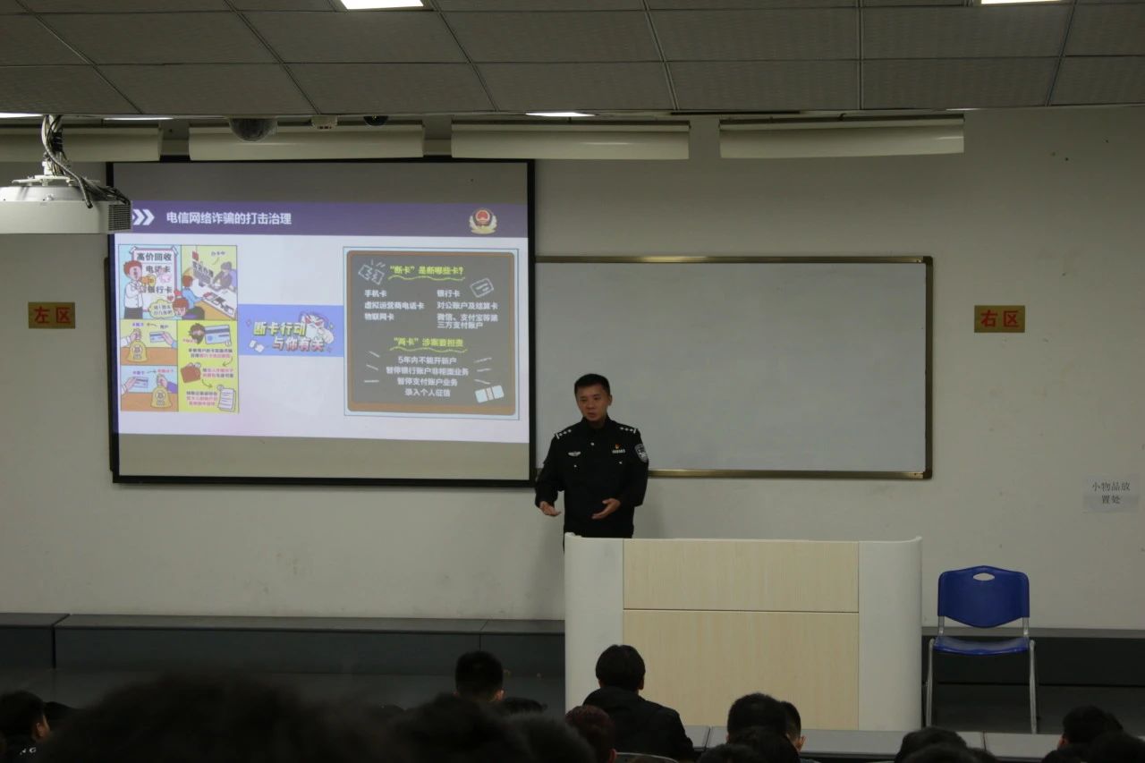 本网讯,赵博、湛启畅、游国瑀、周思豪摄影报道为进一步提高开云官网学生的安全风险意识,中飞院公安局曾阳警官应邀为开云kaiyun体育2023级全体新生举办了一场关于大学生安全问题的宣讲会。宣讲会主题涵盖了黄、赌、毒、网络安全,特别聚焦网络诈骗问题。