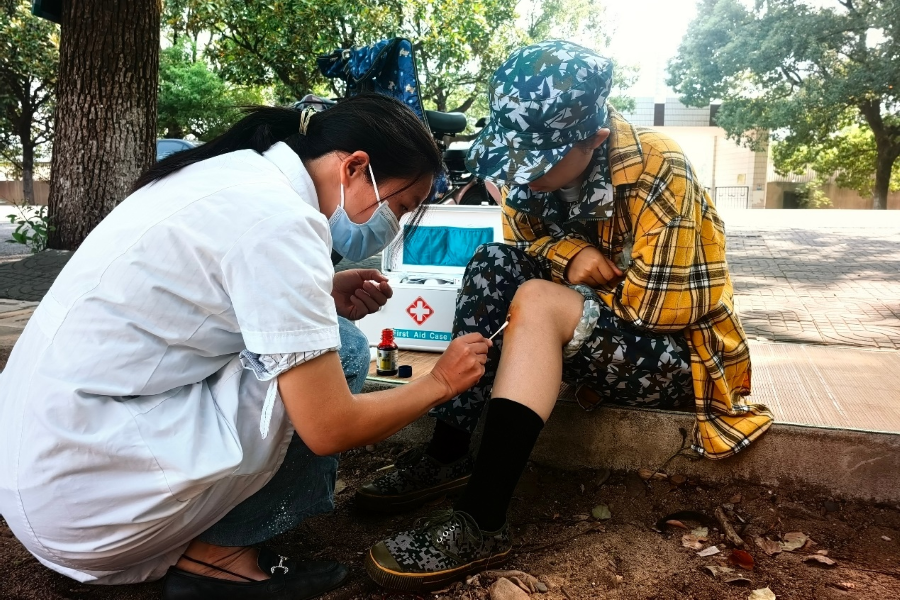 为更好地保障军训期间防疫与医疗服务工作,学院专门设立医疗站提供医疗物品与能量补给品,将学院对学生的医疗健康关怀落到实处。感冒、受伤、昏迷、身体不适都是军训中常发生的情况,而医疗队成员们充分运用应急救护知识应对训练场上的突发事件,第一时间为新生们进行救助服务。