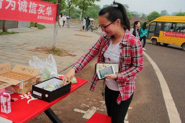 不久,已在食堂吃过早餐的王同学远远望见了“诚信早餐”摊位,赶紧跑了过来,特意又买了一瓶牛奶和一个蛋糕,她微笑着说:“就当为诚信出一份力了!”之后,又有几位同学拿走了蛋糕和牛奶,并自觉付钱。
