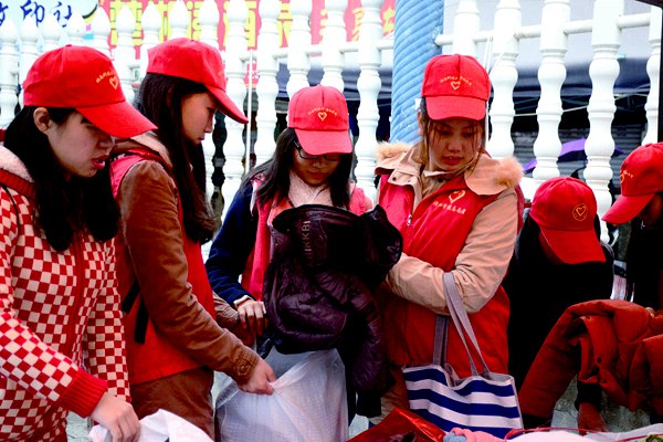 一个上午,南区教师公寓募集点就堆满了装衣物的麻袋,里面有棉衣、毛衣、被褥、书包和鞋等。由于这是一次为抗战严寒对有需要帮助的人举行的一次募集活动,所以志愿者在整理募捐物品时会将此次派不上用场的东西分类出来,以便日后捐赠。志愿团成员在活动前便挨家挨户进居民楼中宣传,并留下爱心人士的联系方式,当冬衣送到那些贫困地区时,会通过短信告知他们。